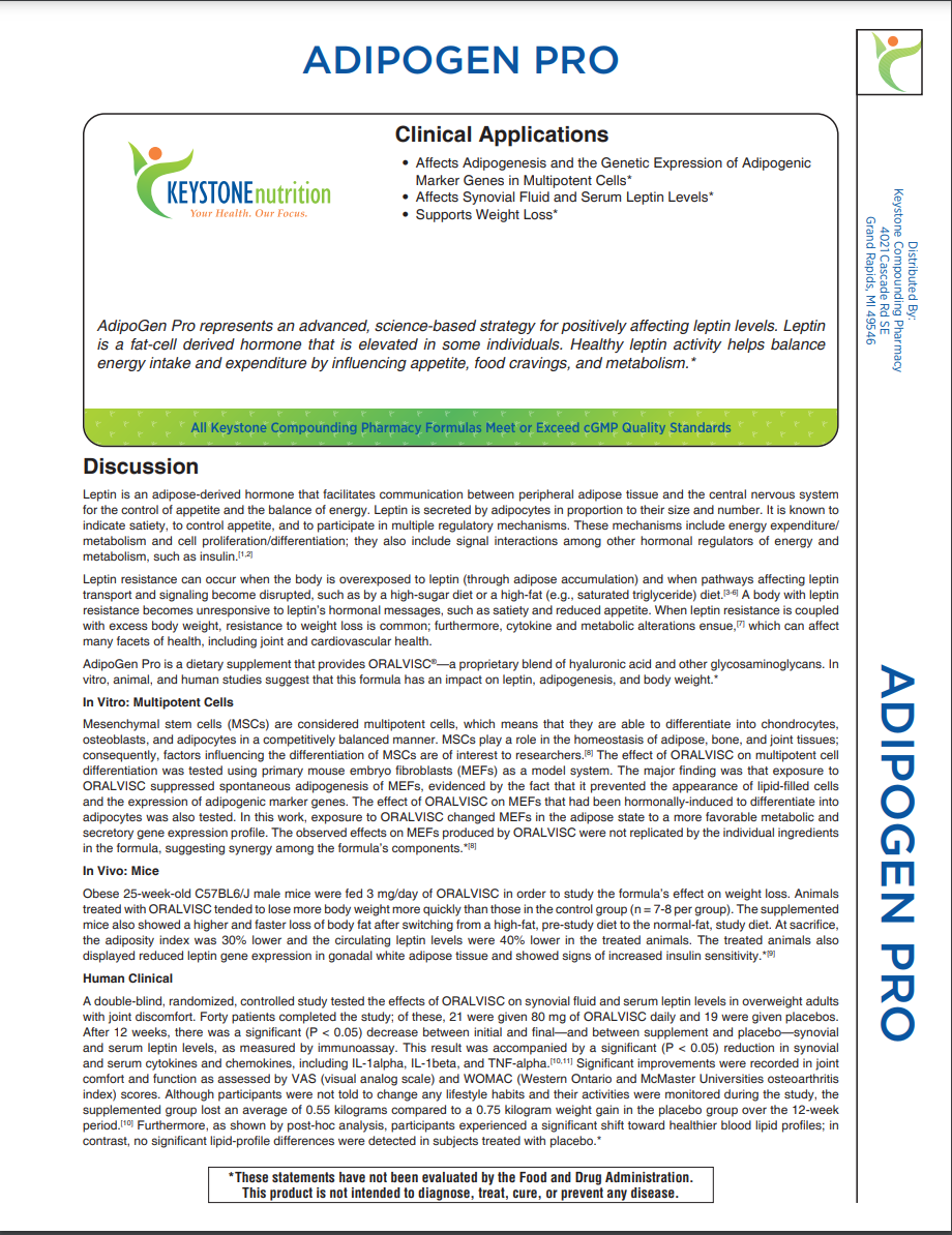 Adipogen Pro represents an advanced, science-based strategy for positively affecting leptin levels. Leptin is a fat-cell derived hormone that is elevated in some individuals. Healthy leptin activity helps balance energy intake and expenditure by influencing appetite, food cravings, and metabolism.*