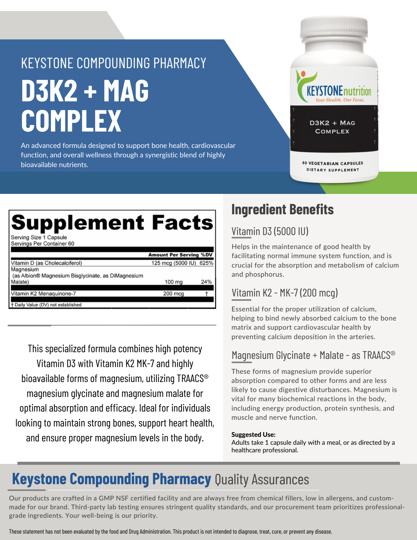 This specialized formula combines high potency Vitamin D3 with Vitamin K2 MK-7 and highly bioavailable forms of magnesium, utilizing TRAACS® magnesium glycinate and magnesium malate for optimal absorption and efficacy. Ideal for individuals looking to maintain strong bones, support heart health, and ensure proper magnesium levels in the body.
