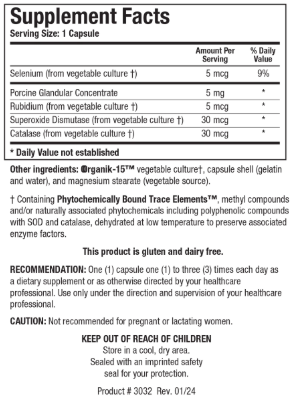 Selenium (from vegetable culture†), Porcine Glandular Concentrate, Rubidium (from vegetable culture†), Superoxide Dismutase (from vegetable culture†), Catalase (from vegetable culture†). † Containing Phytochemically Bound Trace Elements™, methyl compounds and/or naturally associated phytochemicals including polyphenolic compounds with SOD and catalase, dehydrated at low temperature to preserve associated enzyme factors. OOrganik-15™ vegetable culture†,