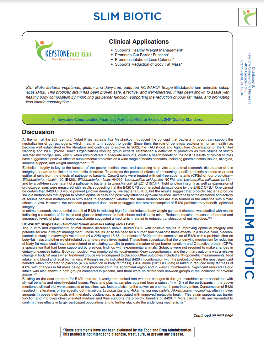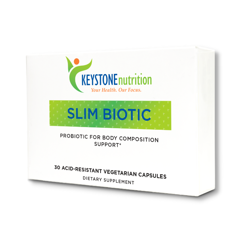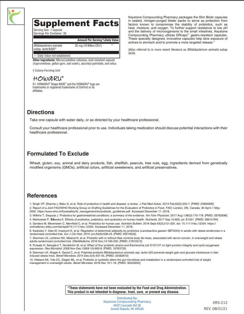 SLIM BIOTIC features vegetarian, gluten- and dairy-free, patented HOWARU® Shape Bifidobacterium animalis subsp lactis B420. This probiotic strain has been proven safe, effective, and welltolerated. It has been shown to assist with healthy body composition by improving gut barrier function, supporting the reduction of body fat mass, and promoting less calorie consumption.*