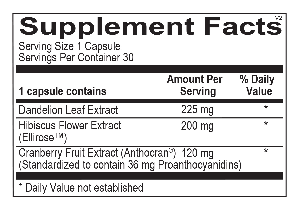 UT Support is a formula designed to support kidney and urinary tract health and to help to promote microbial balance. The formula includes Anthocran®, a cranberry extract which standardized to 36 mg proanthocyanidins (PACs), which makes it has been shown to be the optimal daily dose for urinary tract health. UT Support also includes dandelion leaf extract, which naturally flushes out urinary passages and Ellirose an extract of hibiscus flower shown to promote healthy microbial balance in the urinary tract. Each capsule of UT Support includes 120 mg Anthocran®, 225 mg dandelion leaf extract and 200 mg Ellirose.